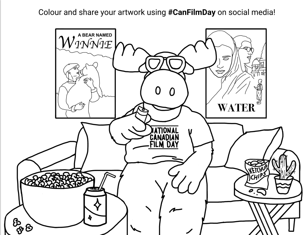 Extra fun! Colour in our mascot, Maurice the Moose, doing his favourite thing – watching a Canadian film. Send him your masterpiece on social media at @thereelmaurice!